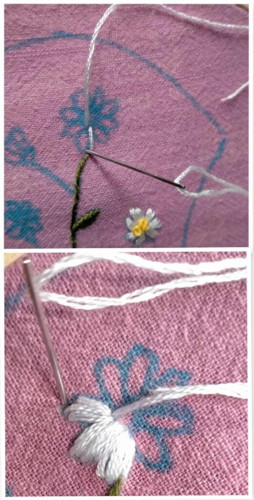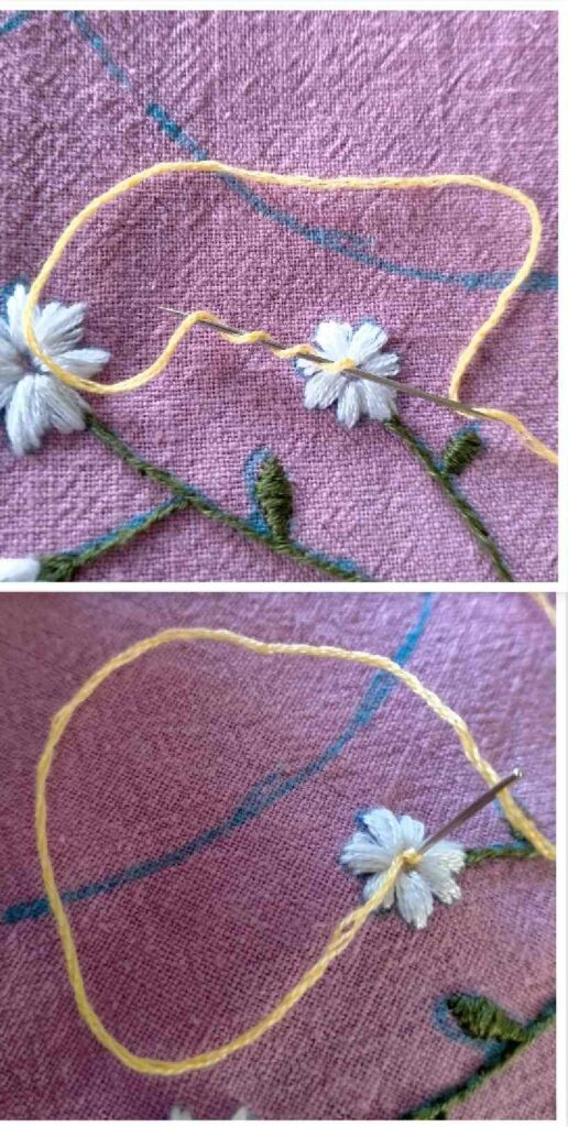 - Stitch using 3 white threads the flower petals using a ‘satin stitch’.