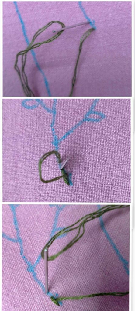 2. Start a new stitch in the middle of the loop. Pull the thread carefully.