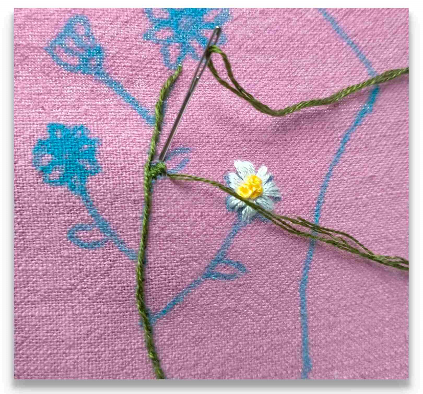 - Stitch with 2 green threads the flower stems using a ‘stem stitch’.