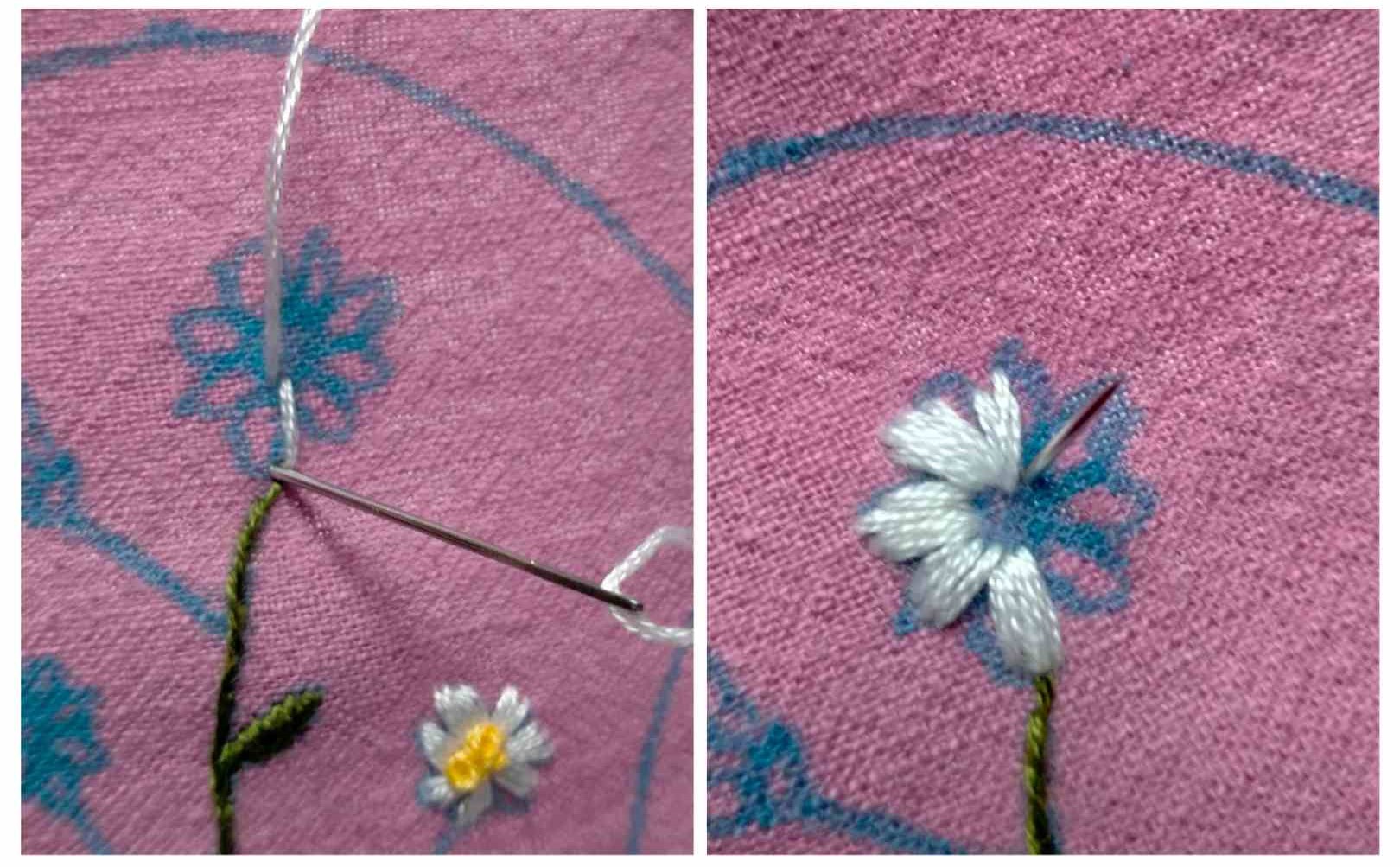 - Stitch using 3 white threads the flower petals using a ‘satin stitch’.