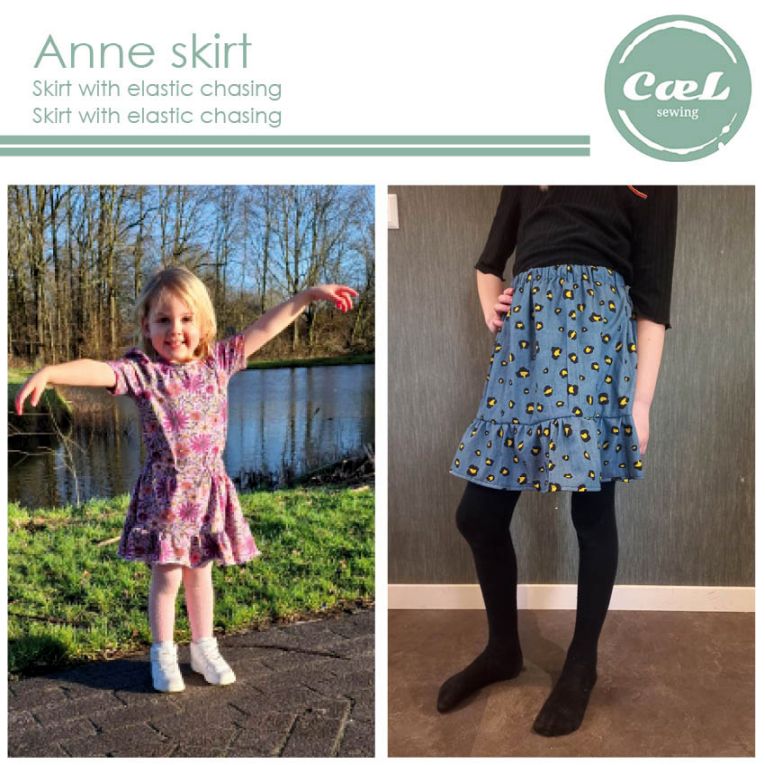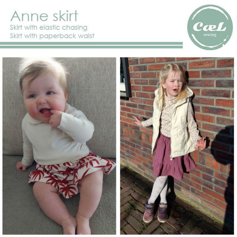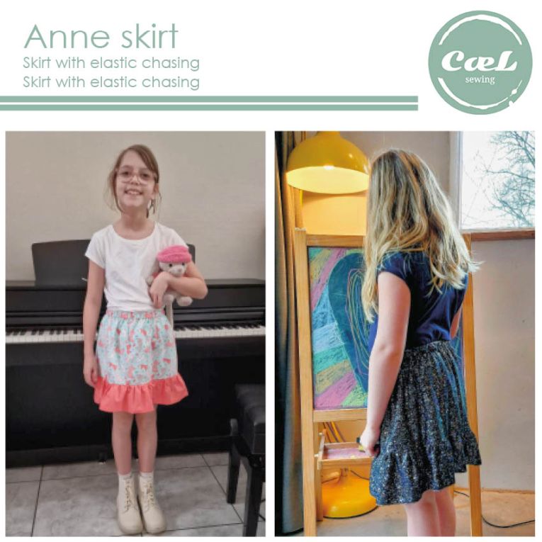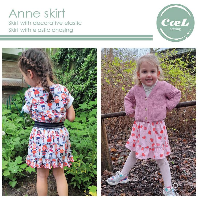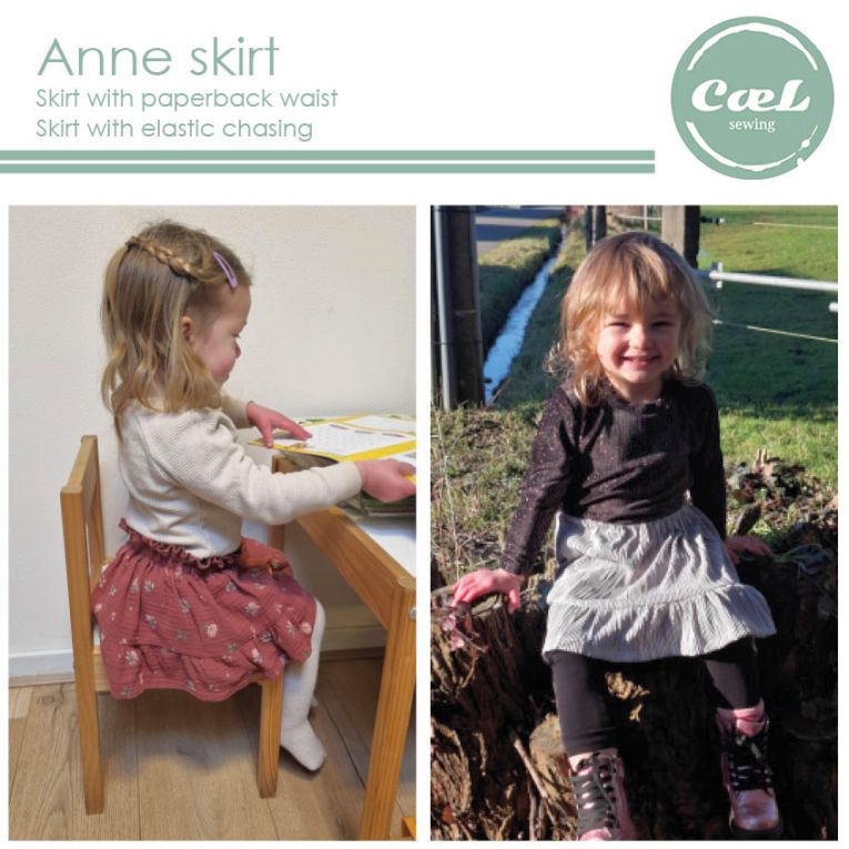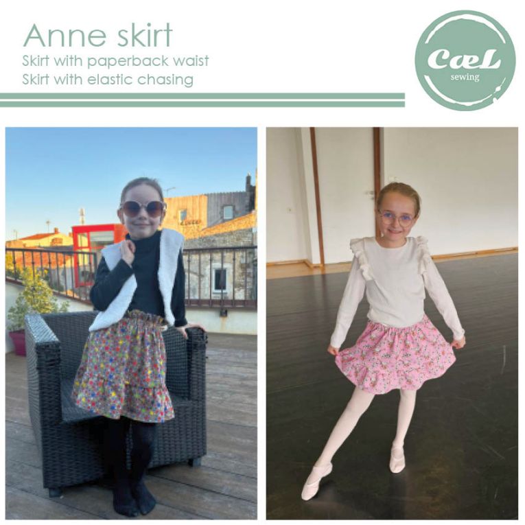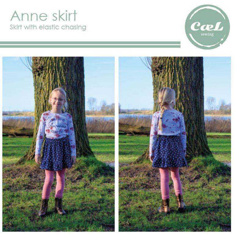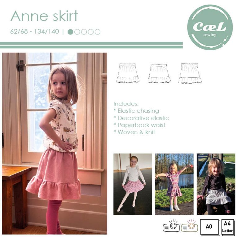 The Anne skirt is a simple knee length skirt with a gathered flounce and a gathered waistline. The Anne skirt features three waistband options to match your preference. Choose from an elastic waistband, a paperbag waistband or an encased elastic waistband. The skirt is designed for knits or flowy woven fabrics. Create a sweet skirt within the blink of an eye! With the code in our Facebook group, you can download this pattern for free.