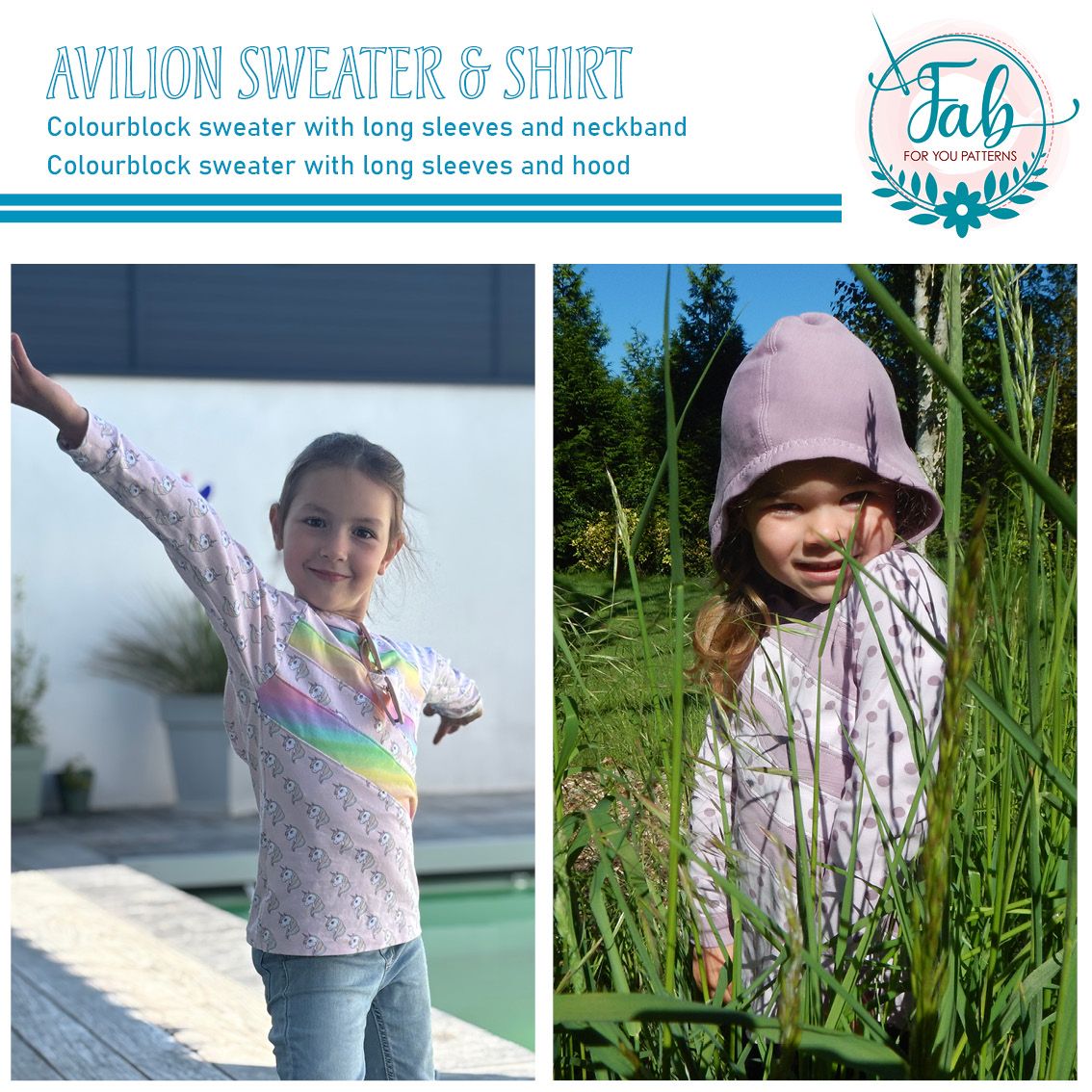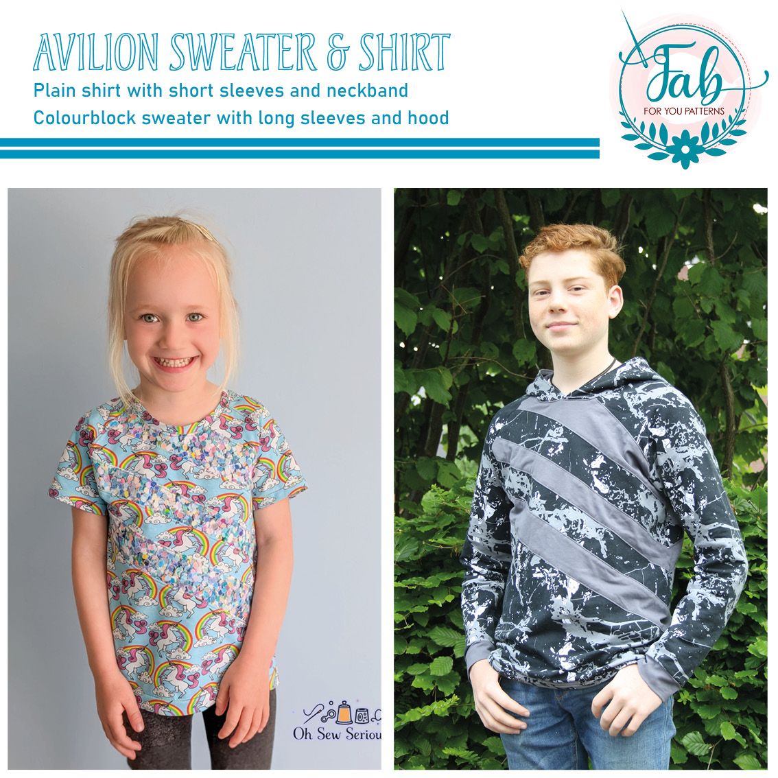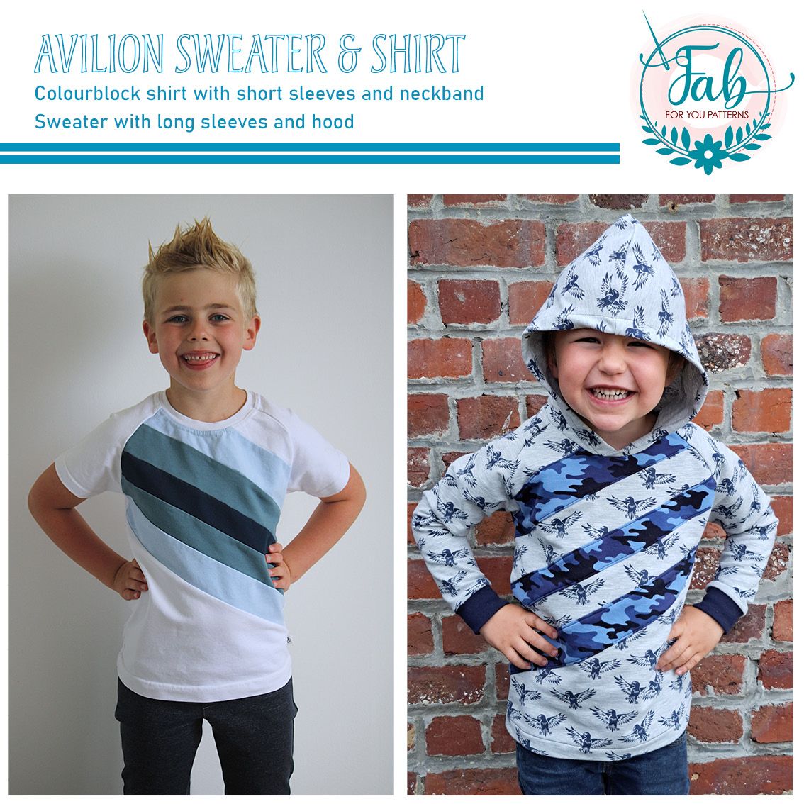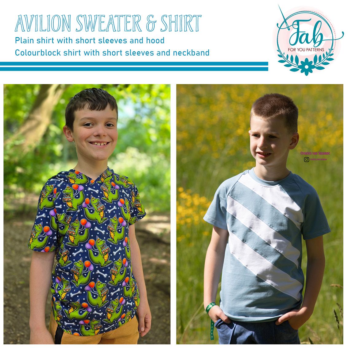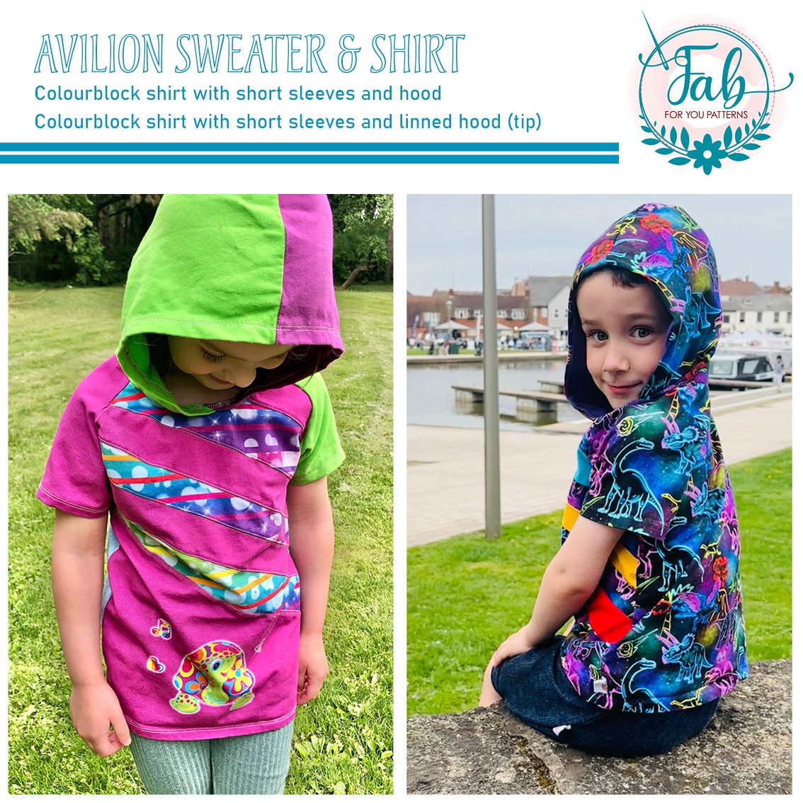 The Avilion Shirt & Sweater is a PDF sewing pattern to create a fun unisex raglan shirt or sweater with a plain front or cool optional diagonally placed colorblocks. It has a scuba hood which can be made with a faux or functional drawstring, but if you don’t like the hood, a normal neckband is also provided. For the sleeves you can choose short or long sleeves. As always with Fab For You Patterns, there’s also a tip section with some fun ideas to make even more out of the pattern.