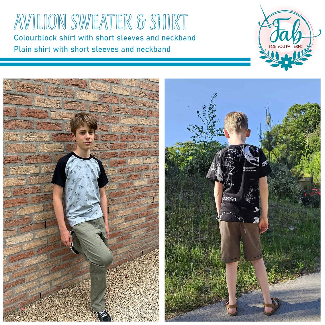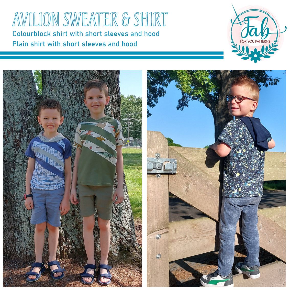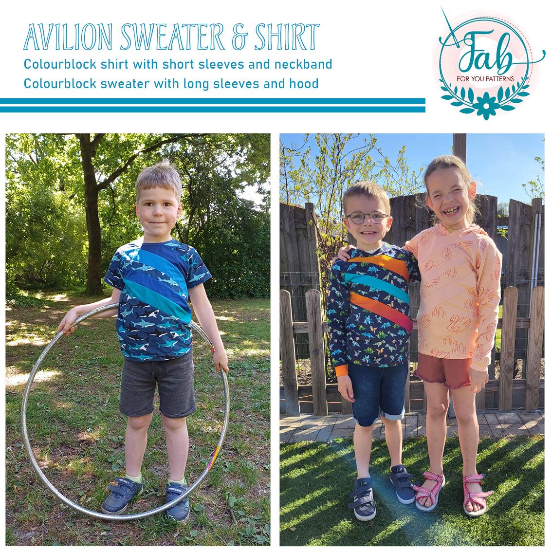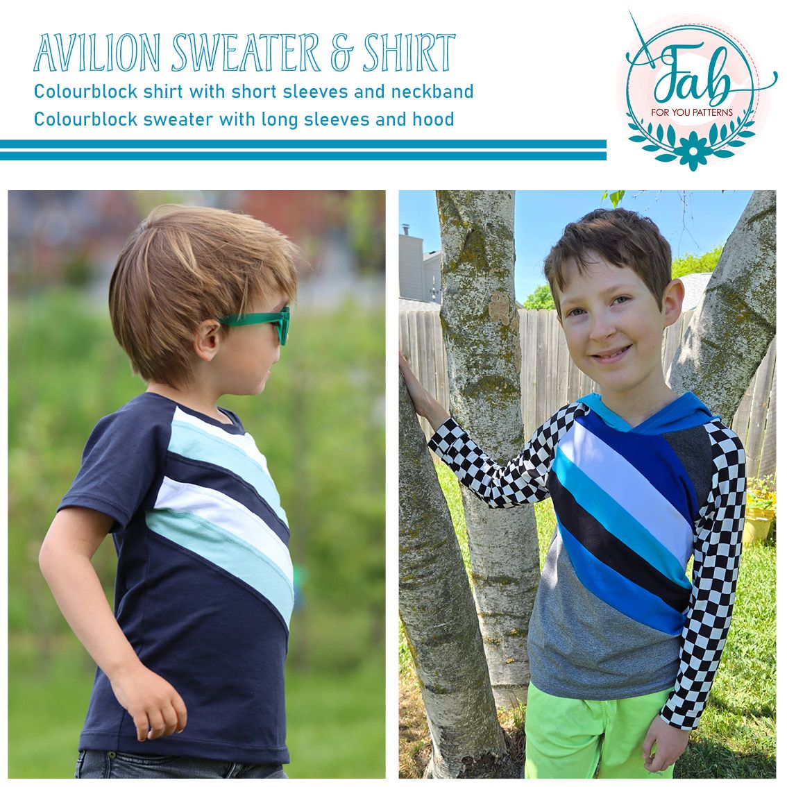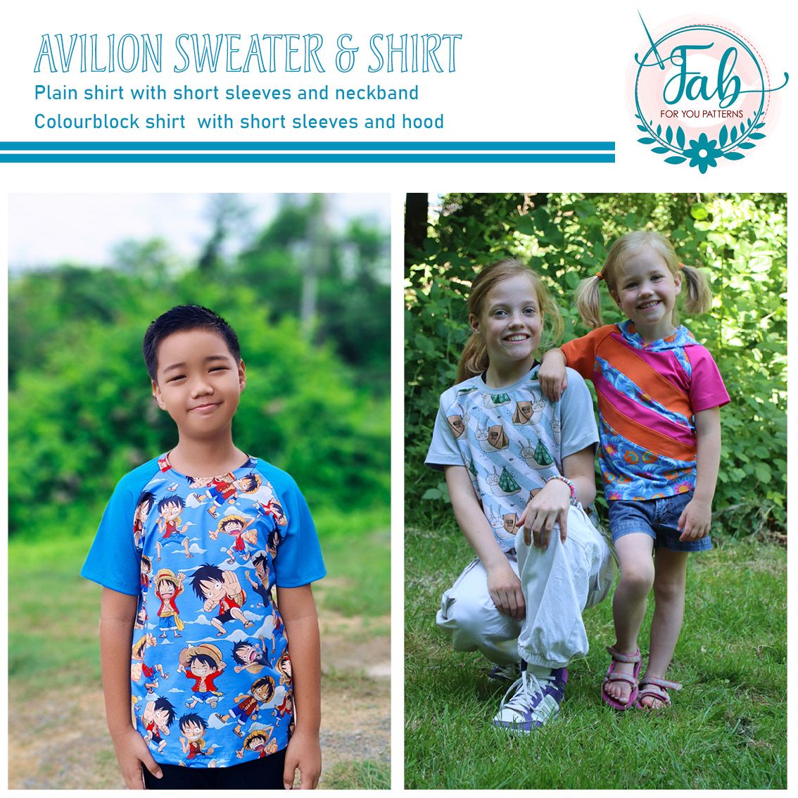 The Avilion Shirt & Sweater is a PDF sewing pattern to create a fun unisex raglan shirt or sweater with a plain front or cool optional diagonally placed colorblocks. It has a scuba hood which can be made with a faux or functional drawstring, but if you don’t like the hood, a normal neckband is also provided. For the sleeves you can choose short or long sleeves. As always with Fab For You Patterns, there’s also a tip section with some fun ideas to make even more out of the pattern.