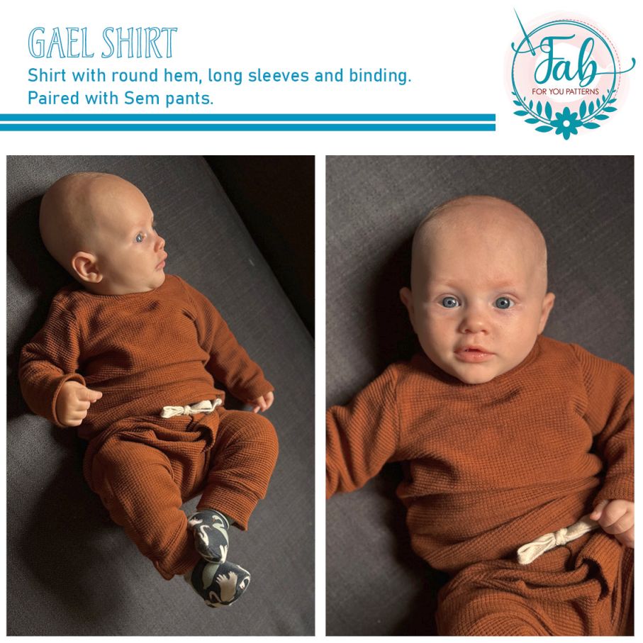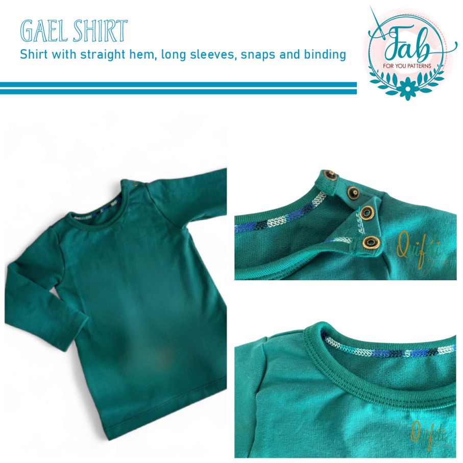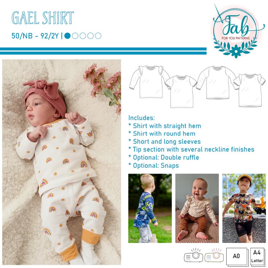 The Gael is a fun PDF sewing pattern to create a basic, yet not so basic shirt for the tiniest models. Gael features a straight hemline and rounded hemline with facing. Choose between short or long sleeves and to make it easy to put it on and off, you can choose to make it with buttons on the shoulder. This way, it will even fit those little babies with their bigger heads without a hassle. Gael is a unisex pattern, but you can embellish it with the optional double shoulder flutter to create a fun, girly look. Gael is a true staple pattern to have in your baby or toddler’s closet all year round. Just when you thought it couldn’t get better: with the code in our Facebook group, you can download this pattern for free.