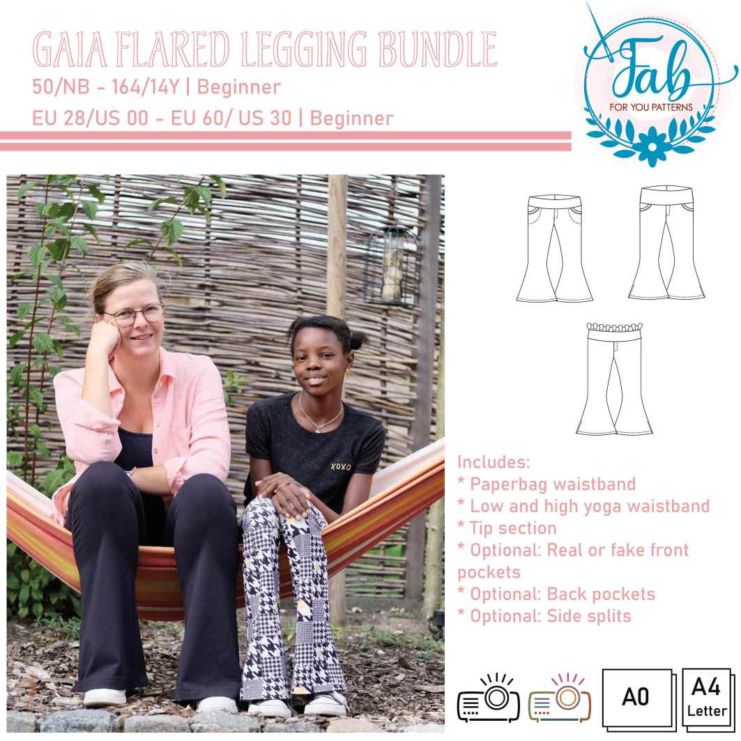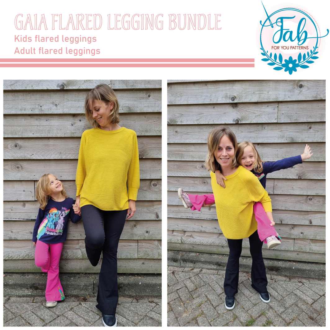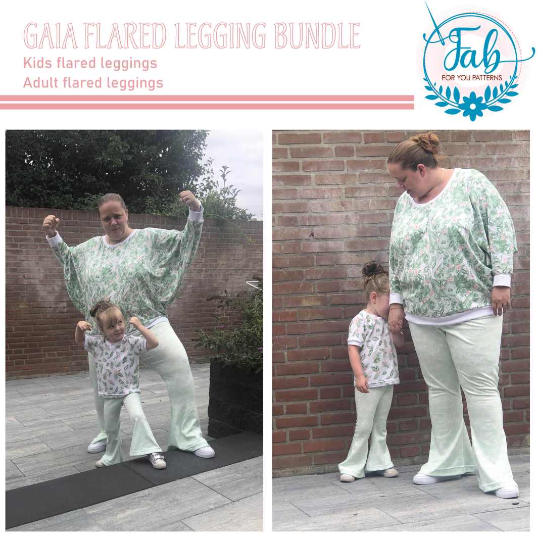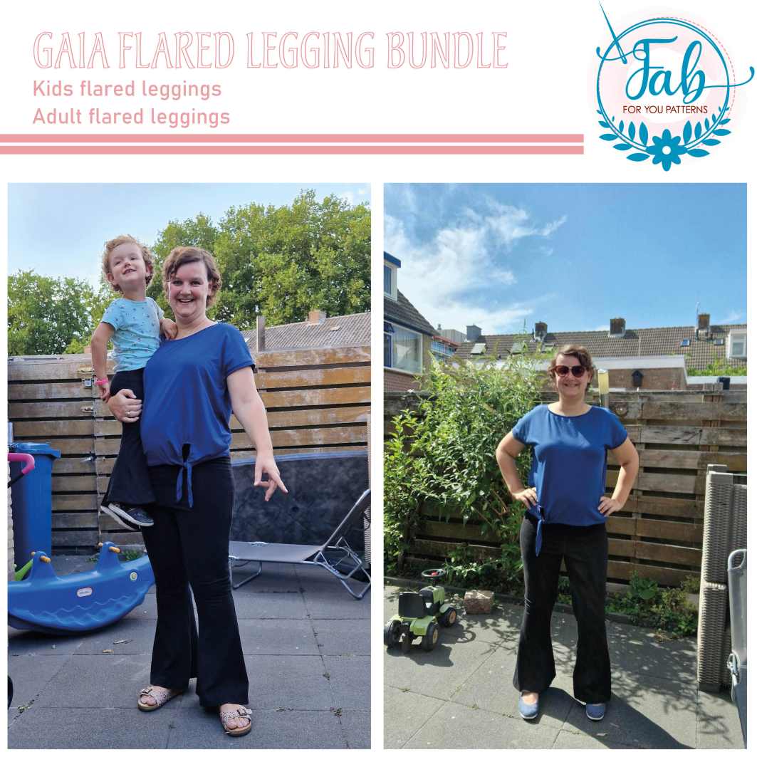 The Gaia flared leggings is your ultimate flared leggings sewing pattern. The Gaia is as comfy as a legging, but you can wear it as pants. Both the Gaia flared leggings kids and adult pattern are packed with options. The Gaia Flared Leggings feature a paper bag waistband and a low or high yoga waistband. The Gaia also has optional side slits. And although the Gaia is called leggings, the pattern features both front and back pockets and a fake fly to be able to make it look more like pants rather than leggings. The back pockets of the Gaia Kids can be embellished with a fancy bow. The Gaia is the perfect pants to wear with one of our tops or peplums. What’s better than twinning with your kid in your Gaia Flared Leggings? When purchasing the bundle, you’ll get all files of the Kids and Adult Gaia pattern.
