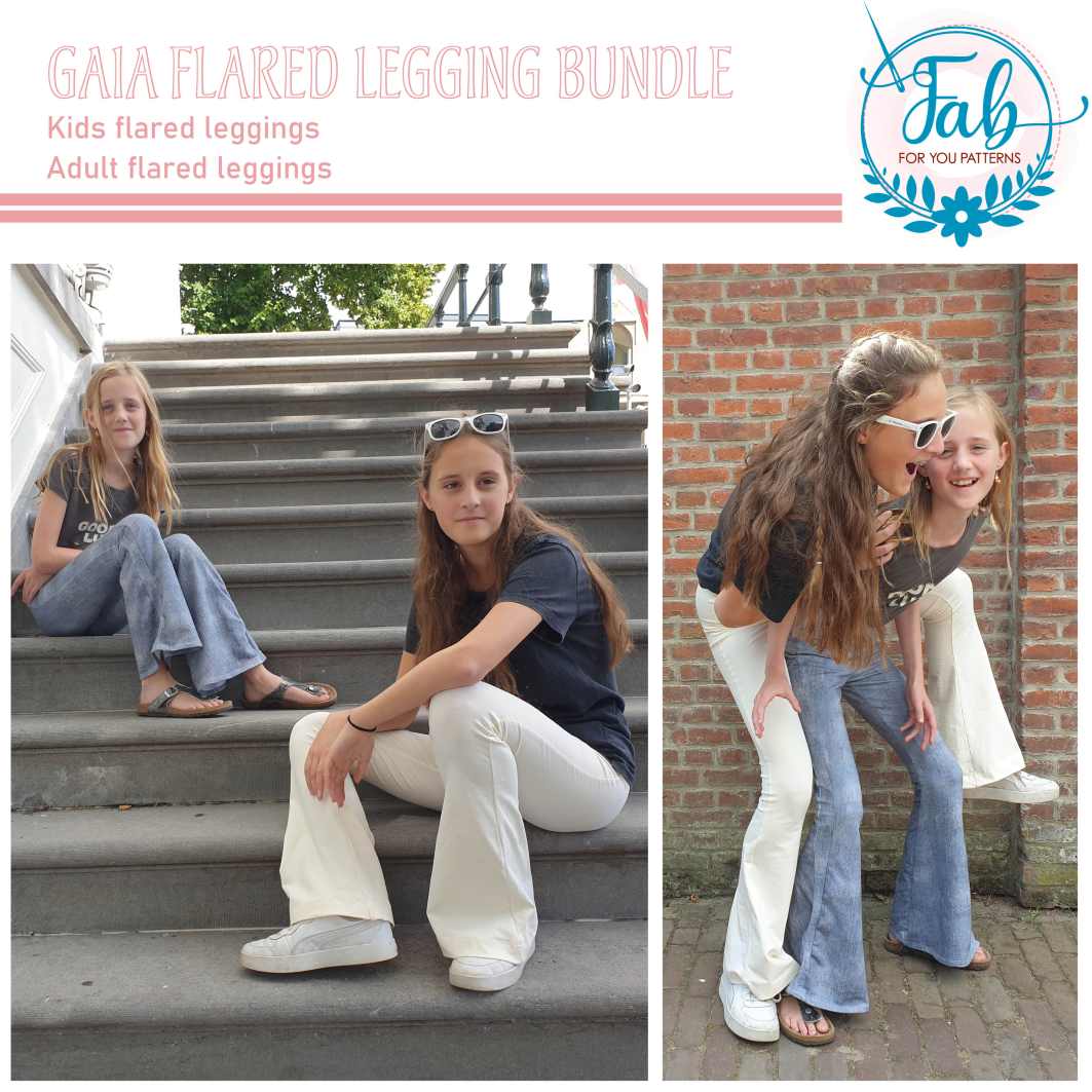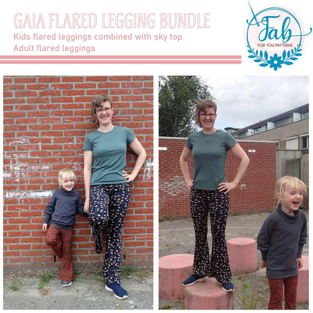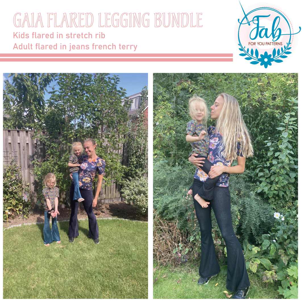 To create the Gaia Flared Leggings kids or adult, we suggest to use medium weight knit fabrics with at least 30% horizontal and vertical stretch like: cotton lycra/jersey, French terry, (summer) sweat or stretch corduroy. You can also use a more lighter or heavier weight knit fabric, but keep in mind that you might need to size up in width if you choose to use a thicker fabric or a fabric type with less stretch than recommended or size down with a thinner fabric or a fabric type with more stretch. Also be aware of the amount of vertical stretch of your fabric. If you use a fabric with less horizontal stretch, you might end up with the Gaia being too short.