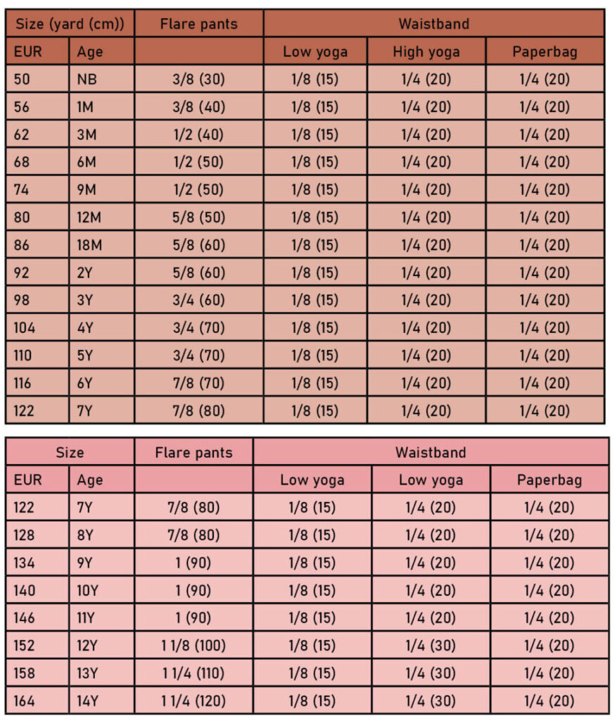 The Gaia Flared Leggings for kids has been designed according to the pink kids size chart. The pattern runs from size newborn (50) up to size 14y (164). Always measure your model and use trunk and inseam measurements to choose the correct length for rise and legs. When your model is on the higher end of the table, you might want to look at the size chart of the Gaia adult to find out if the grown up version will be a better fit. You can find the Adult size chart below.