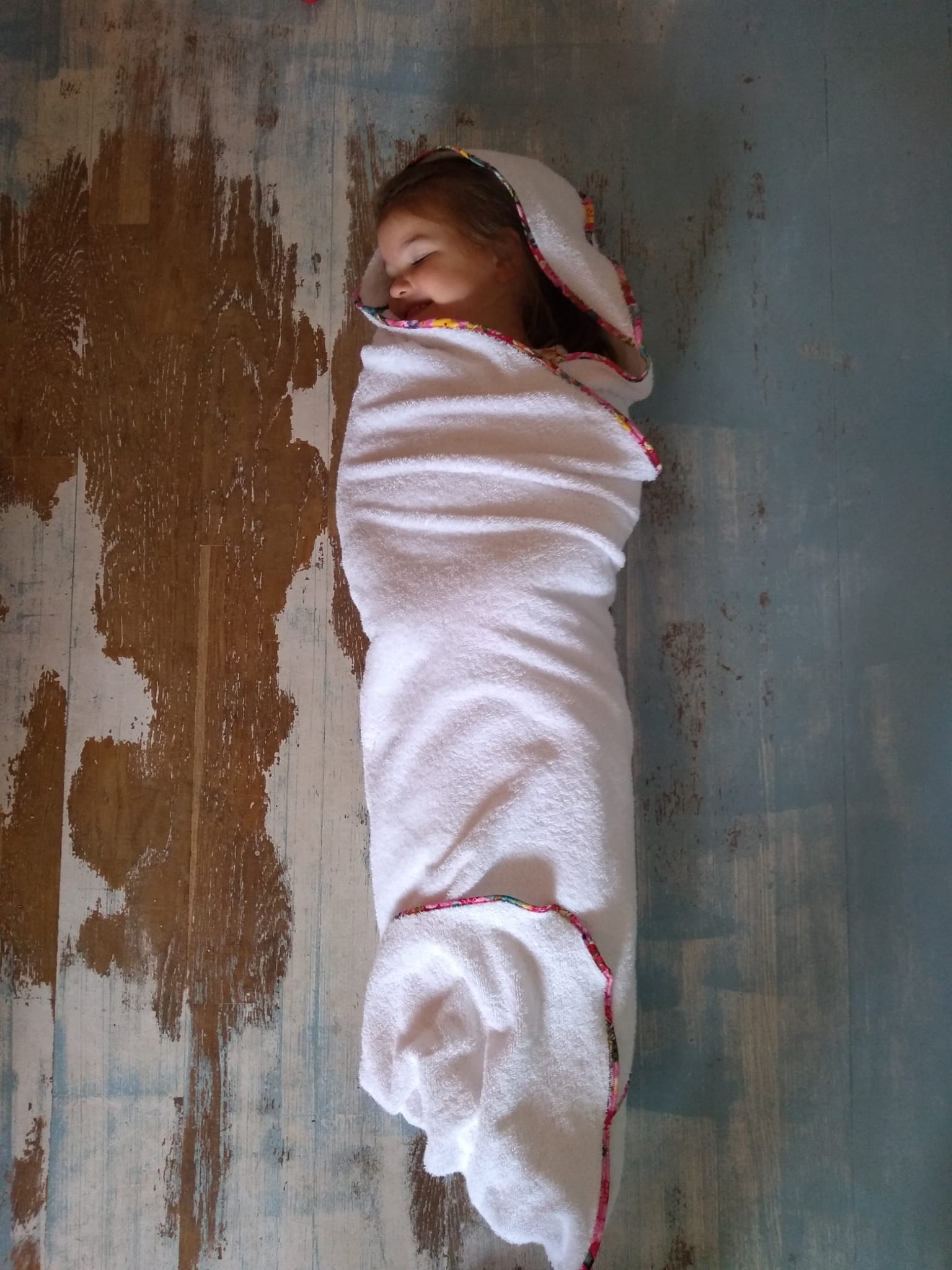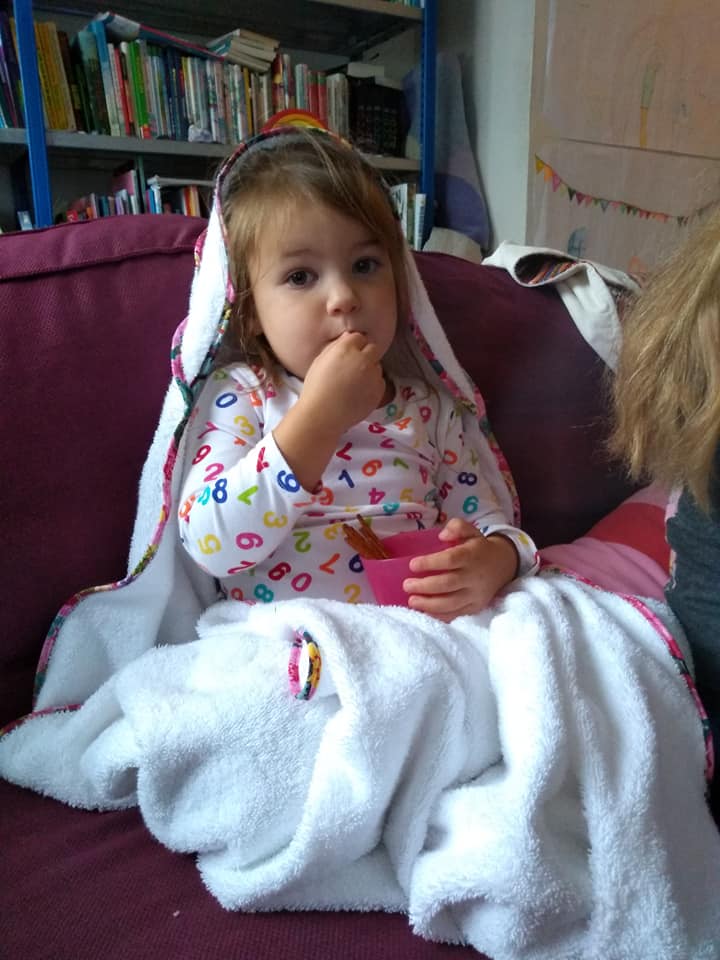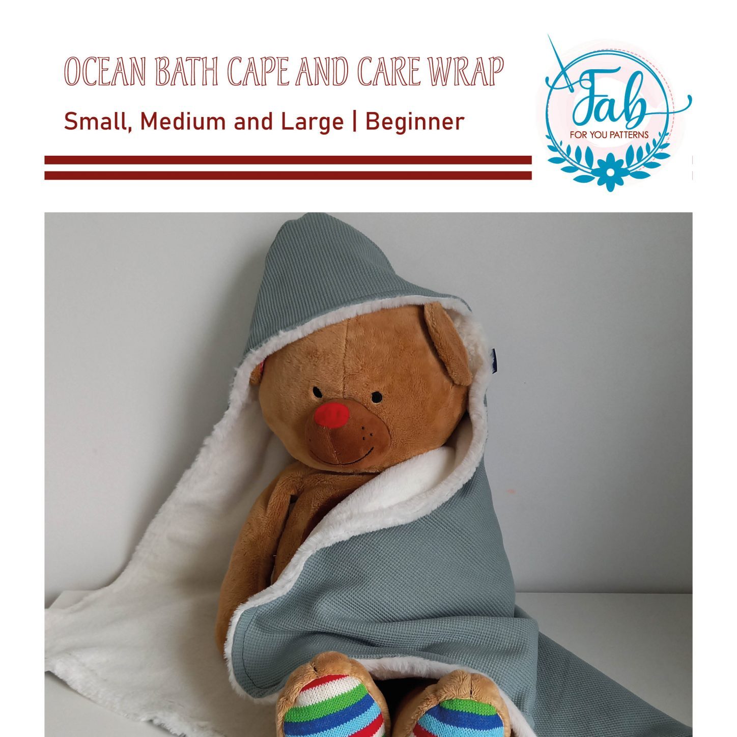 Ocean bath cape and care wrap can be used as a cozy care wrap or a bath cape for after the shower, swimming lesson or bath. The bath cape and care wrap can be made out of different fabric types like teddy, terry cloth, waffle, fleece, cotton, flanel, french terry, double gauze. This pattern is free for our Facebook Group members. You will find the code in the announcements.
