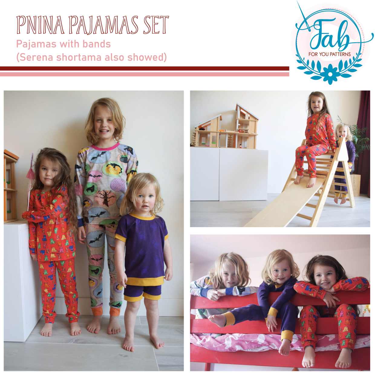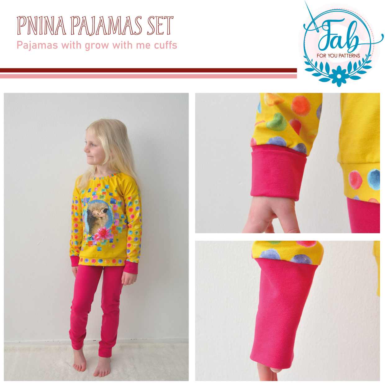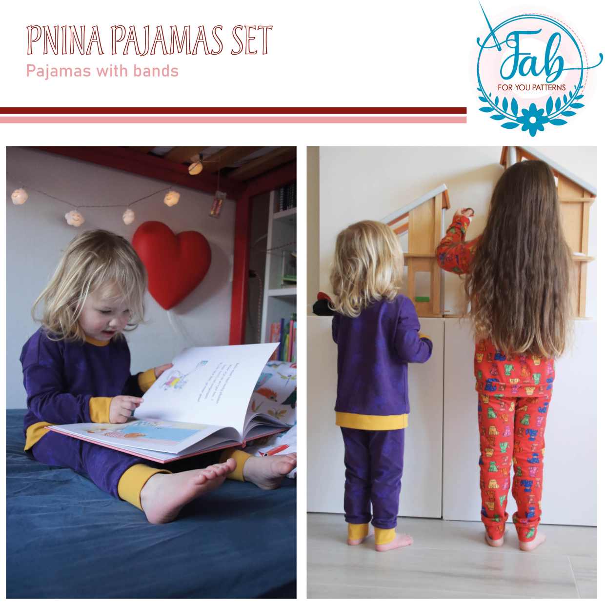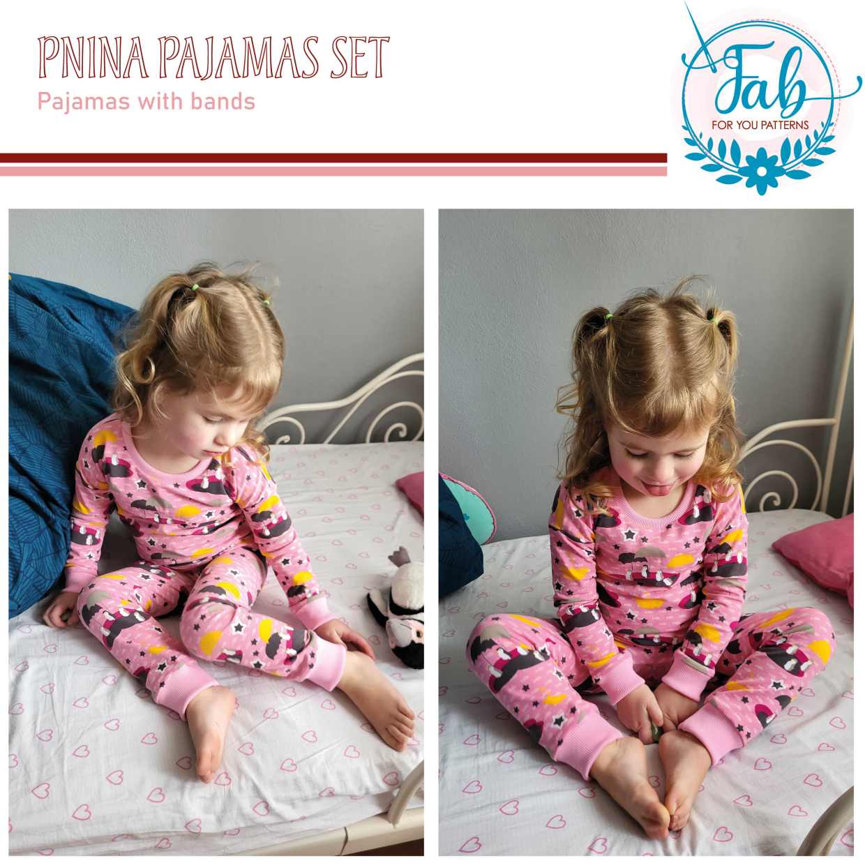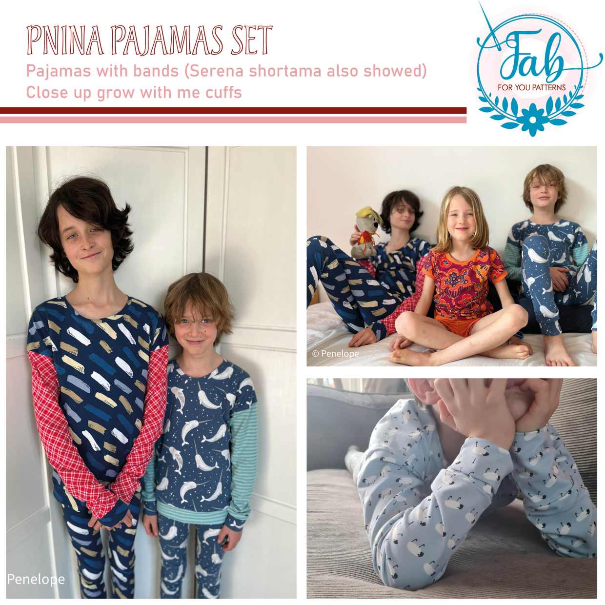 Pnina is a traditional pajamas. The shirt is made with long sleeves. The pants can be made in a smaller and wider option in long length and finished with bands. The complete pajamas can be made without hemming. For the waistband of the pants you can choose from a low yoga, high yoga or elastic waistband. The bands can be made in the main fabric or ribbing, the yoga waistband is made for 4-way stretch jersey. You can choose normal or grow with me cuffs for the pants and shirt.