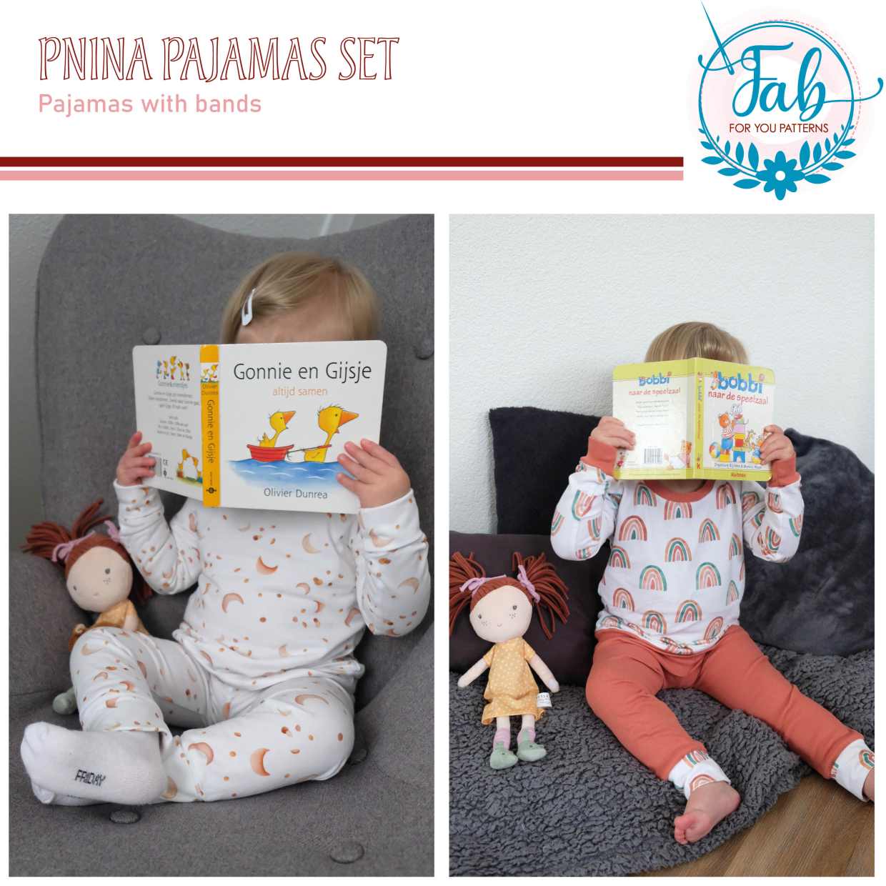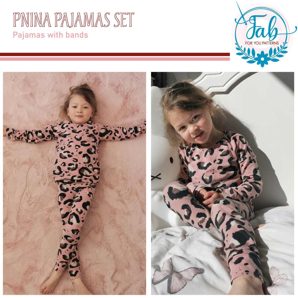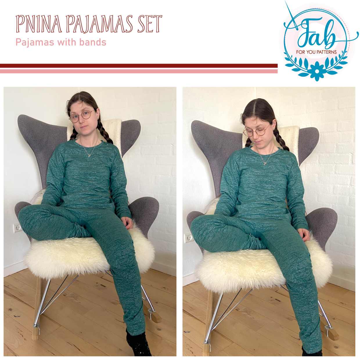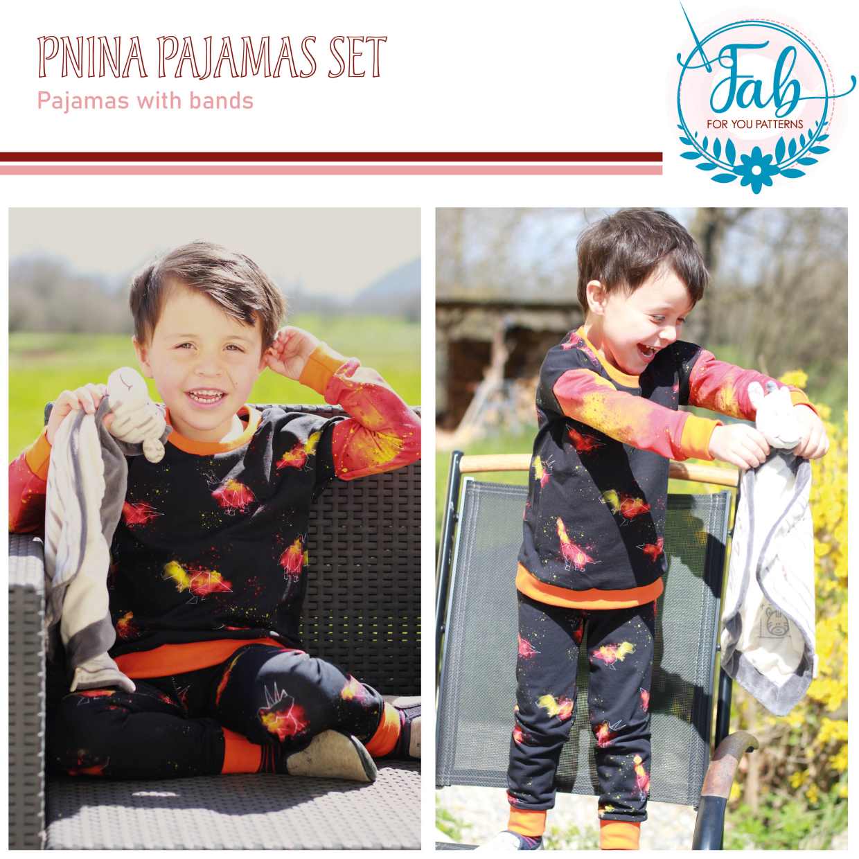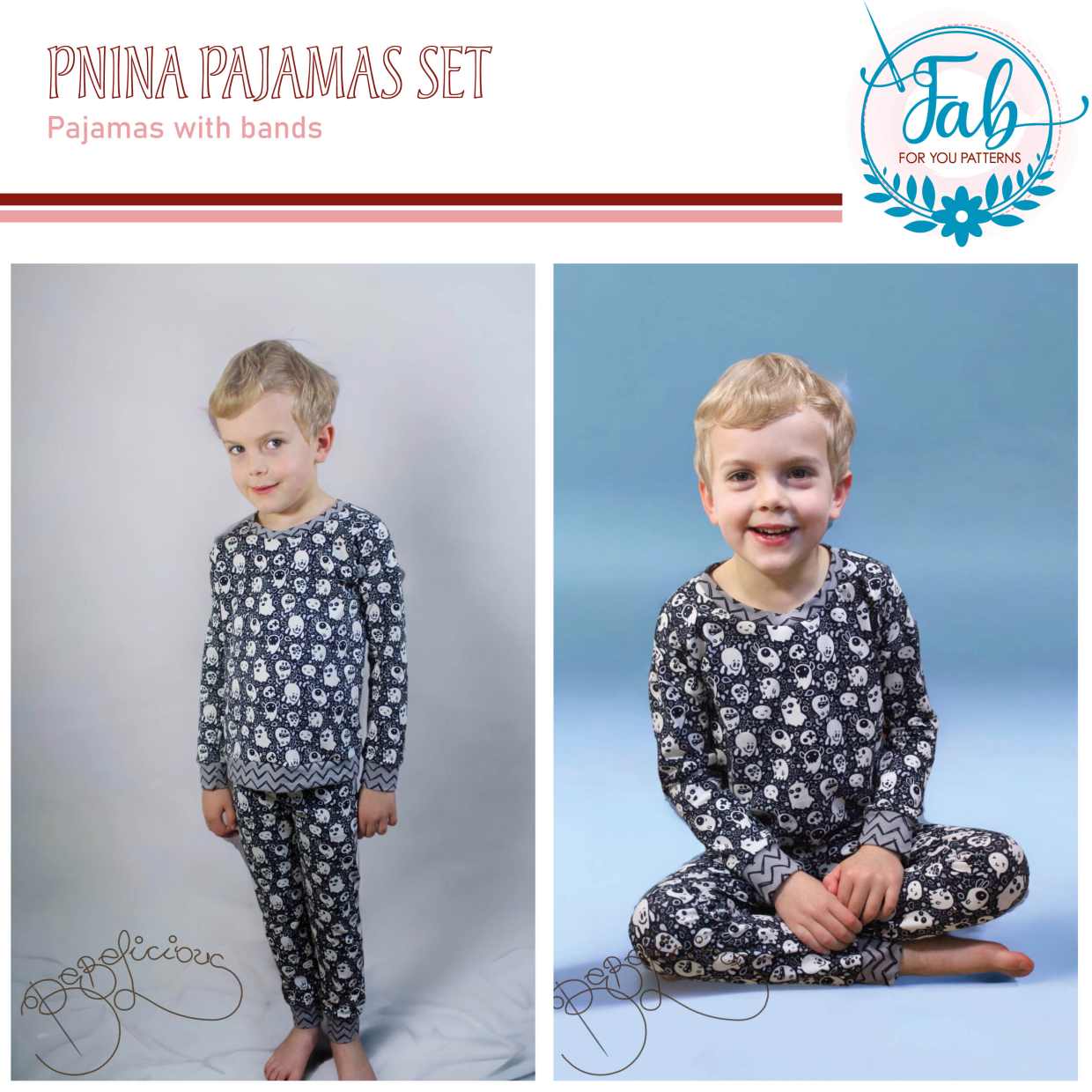 Pnina is a traditional pajamas. The shirt is made with long sleeves. The pants can be made in a smaller and wider option in long length and finished with bands. The complete pajamas can be made without hemming. For the waistband of the pants you can choose from a low yoga, high yoga or elastic waistband. The bands can be made in the main fabric or ribbing, the yoga waistband is made for 4-way stretch jersey. You can choose normal or grow with me cuffs for the pants and shirt.