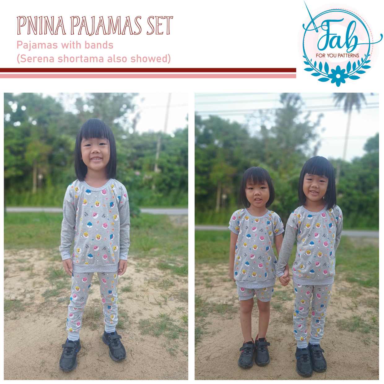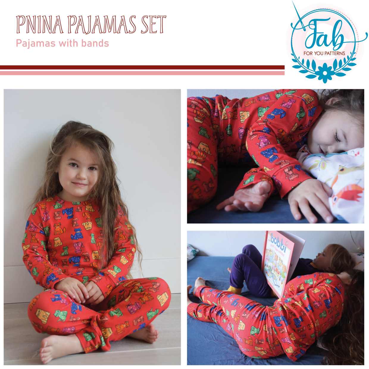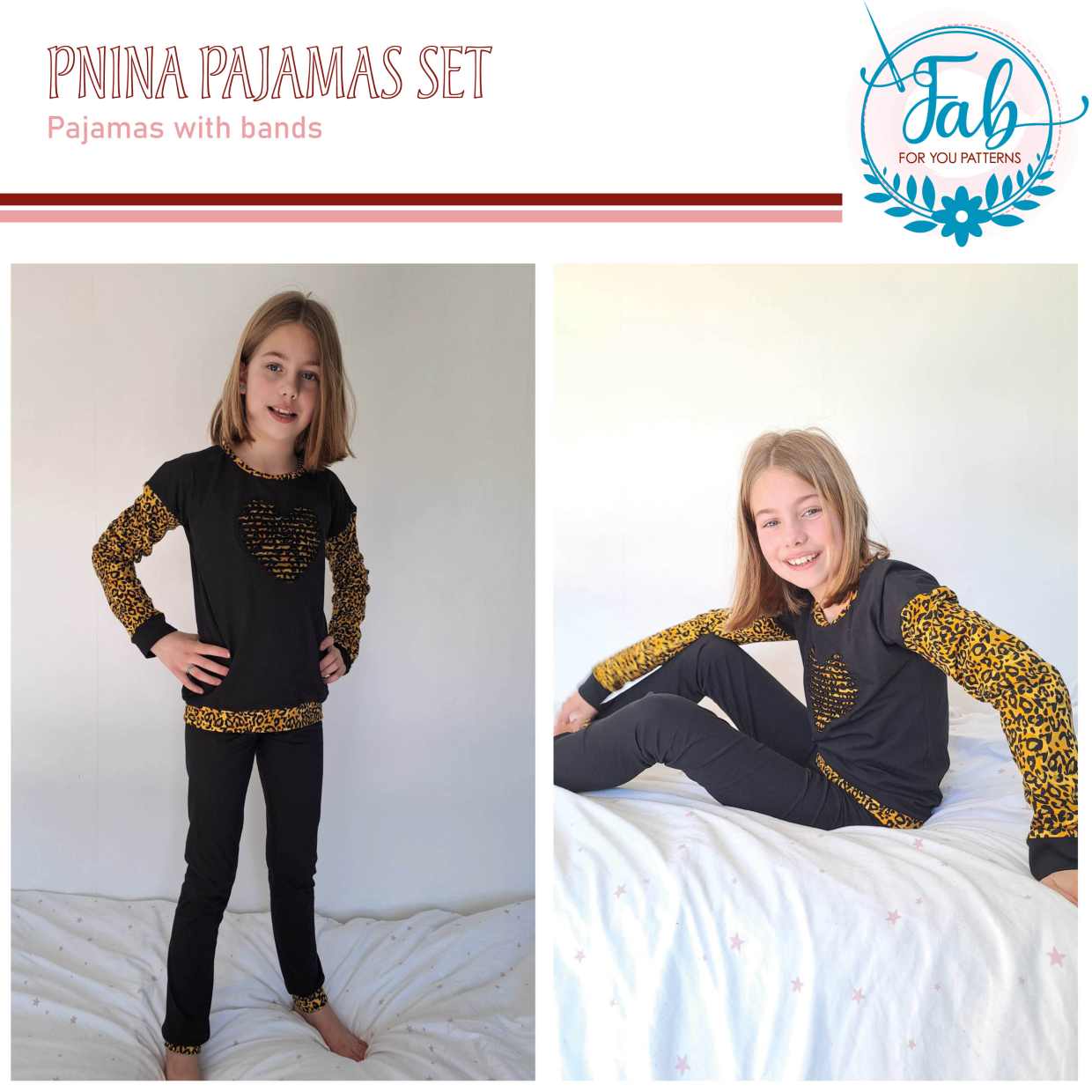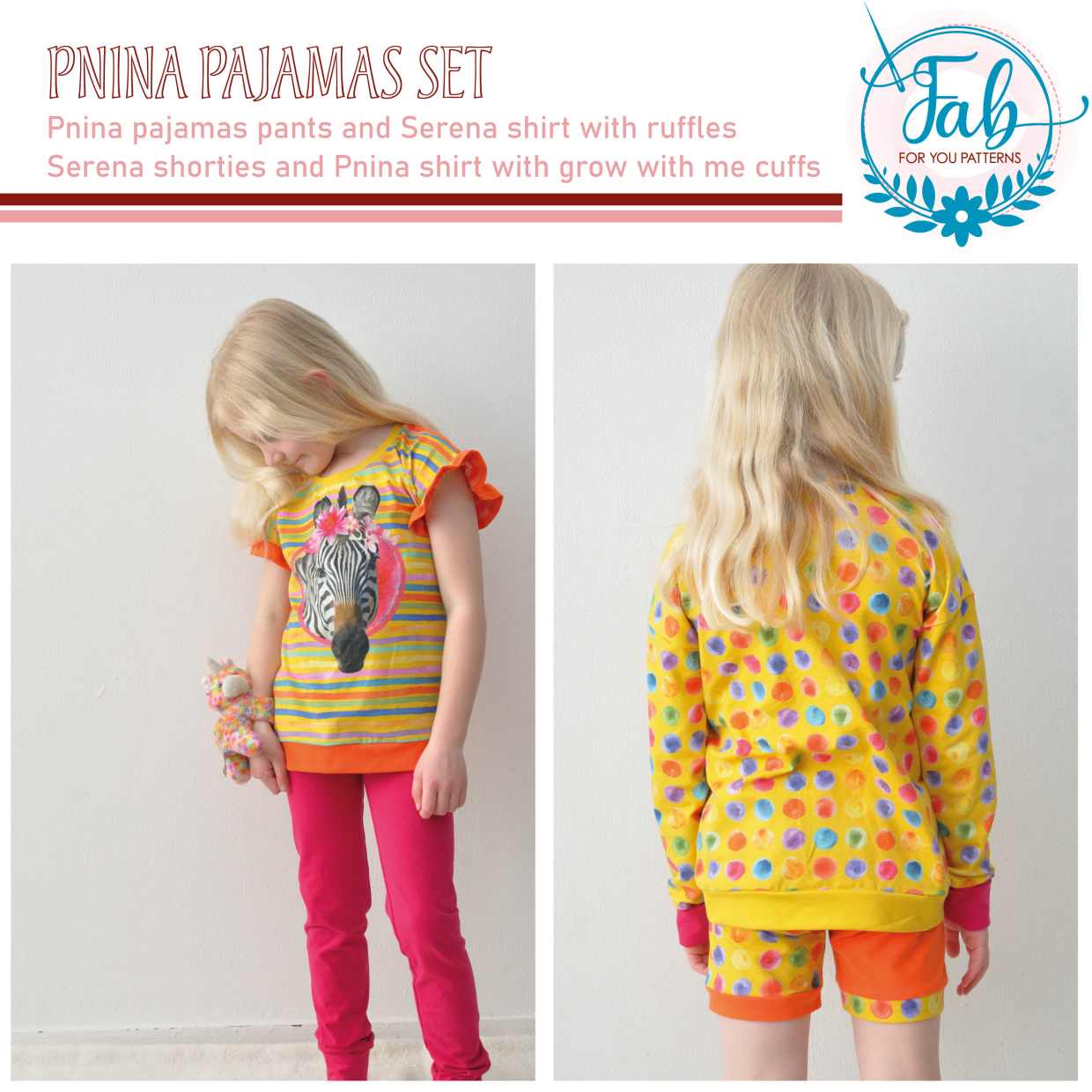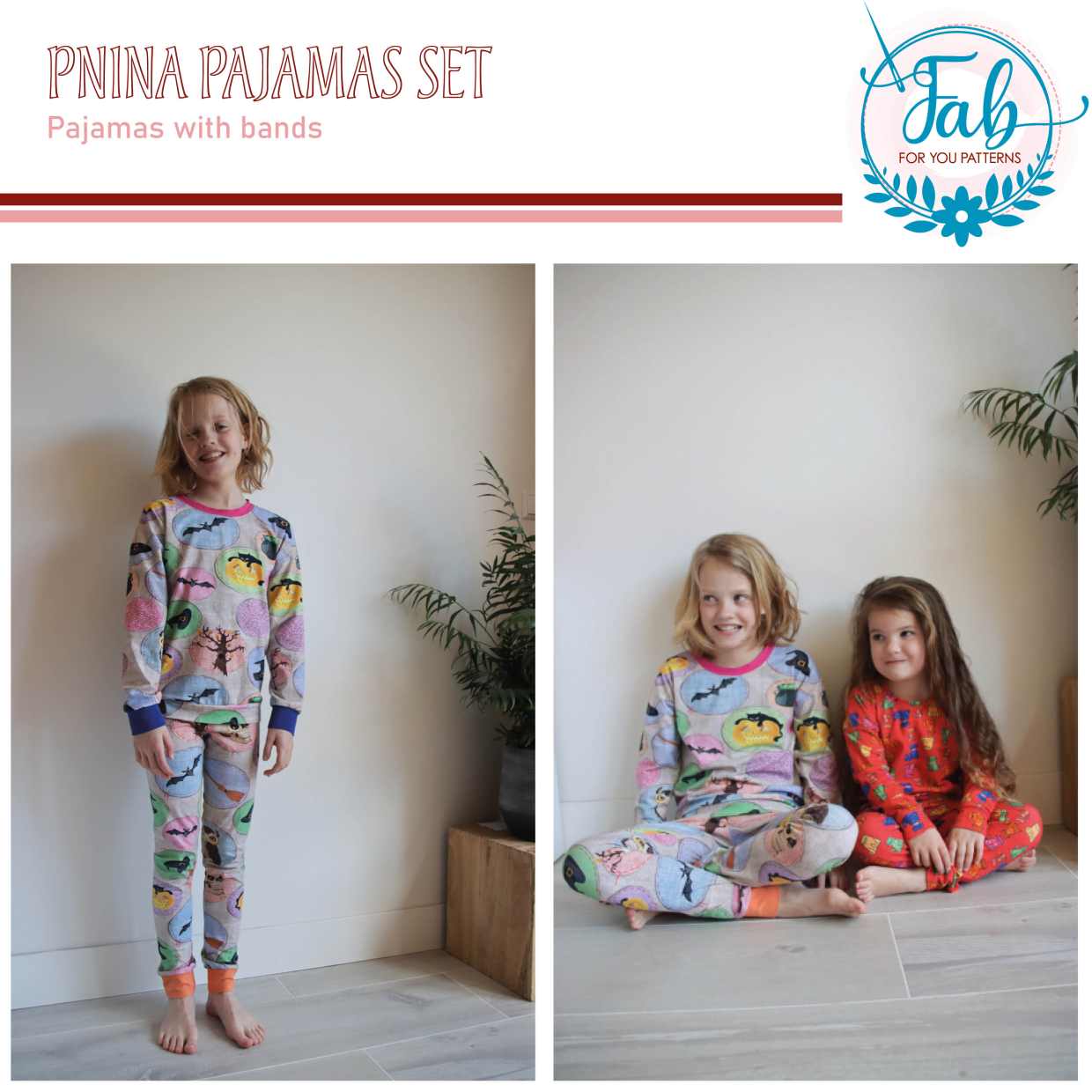 Pnina is a traditional pajamas. The shirt is made with long sleeves. The pants can be made in a smaller and wider option in long length and finished with bands. The complete pajamas can be made without hemming. For the waistband of the pants you can choose from a low yoga, high yoga or elastic waistband. The bands can be made in the main fabric or ribbing, the yoga waistband is made for 4-way stretch jersey. You can choose normal or grow with me cuffs for the pants and shirt.