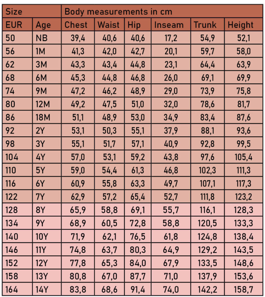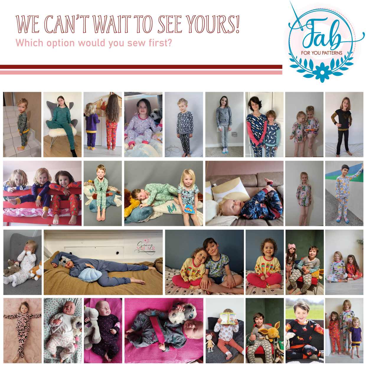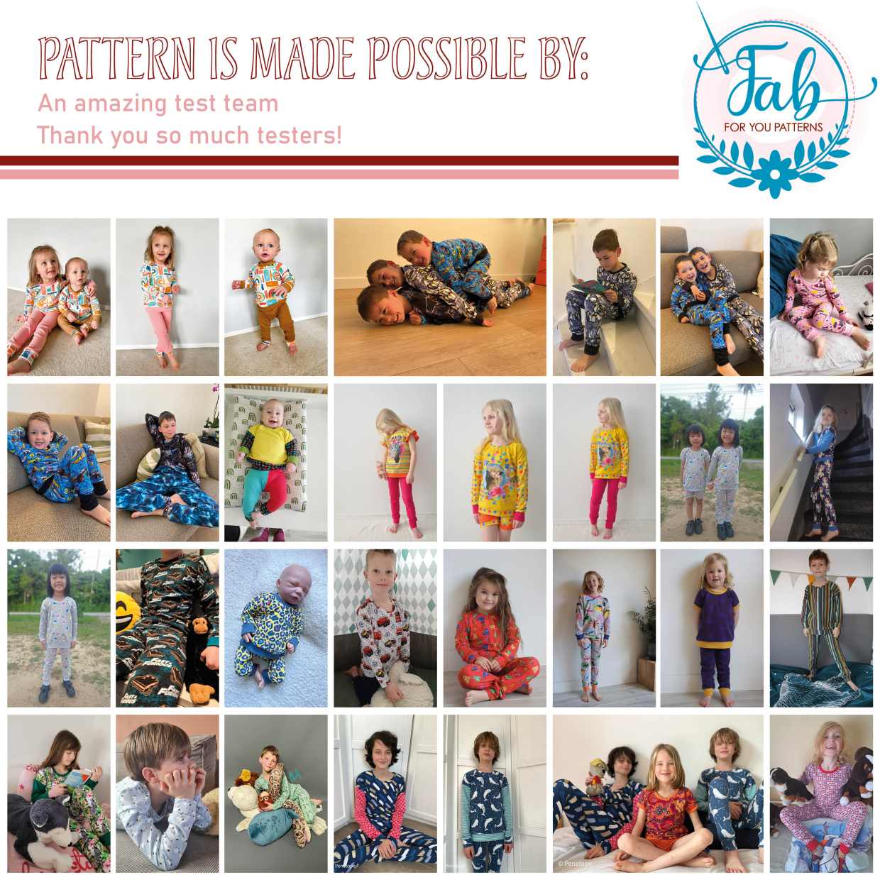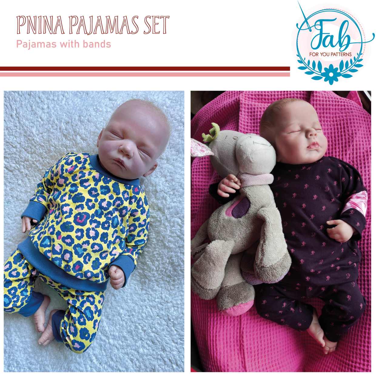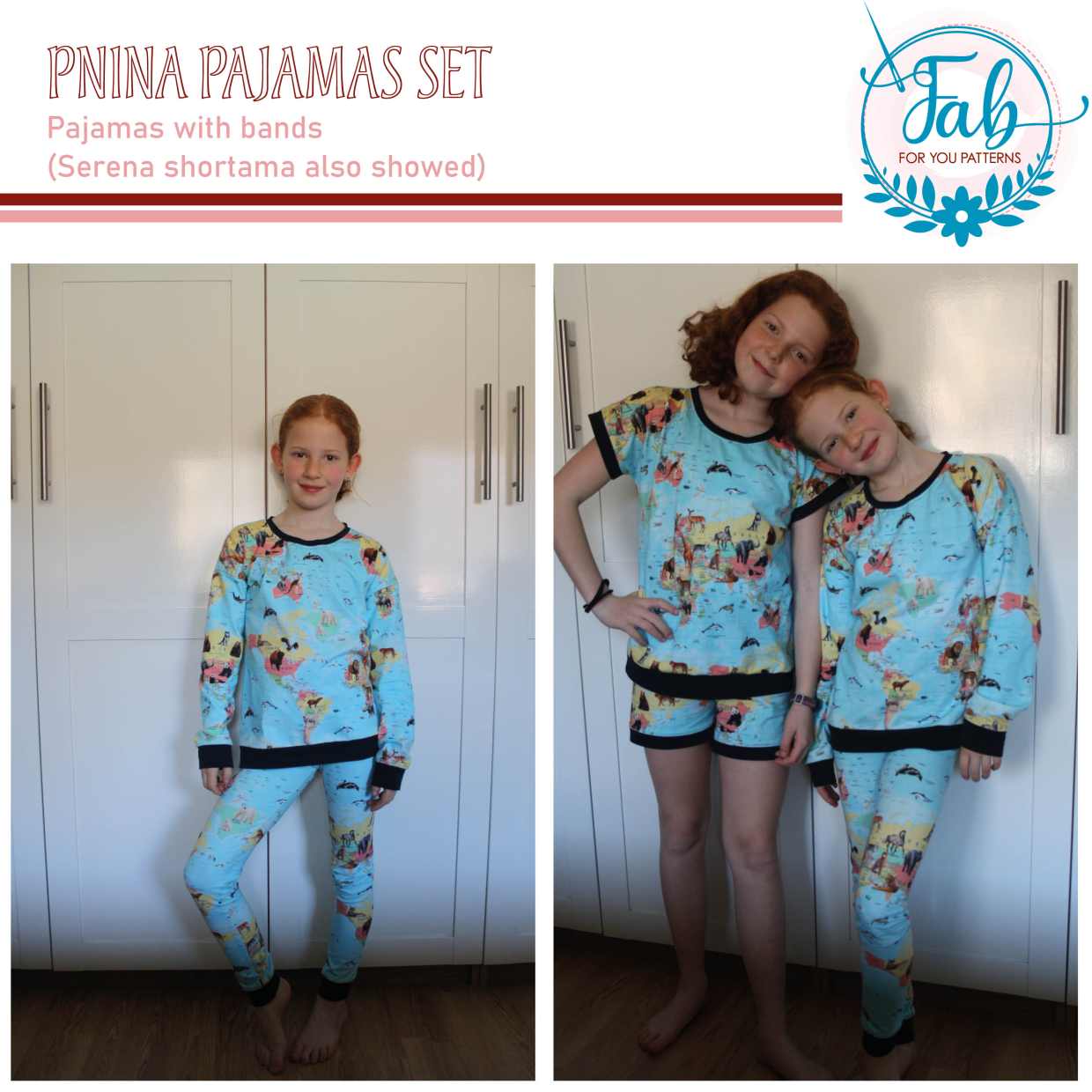 Pnina is a traditional pajamas. The shirt is made with long sleeves. The pants can be made in a smaller and wider option in long length and finished with bands. The complete pajamas can be made without hemming. For the waistband of the pants you can choose from a low yoga, high yoga or elastic waistband. The bands can be made in the main fabric or ribbing, the yoga waistband is made for 4-way stretch jersey. You can choose normal or grow with me cuffs for the pants and shirt.