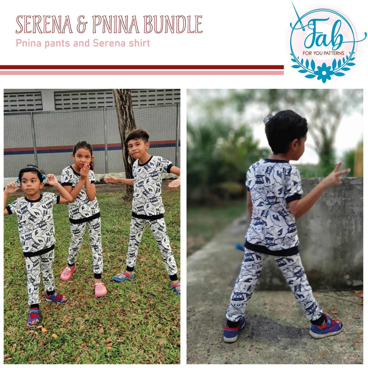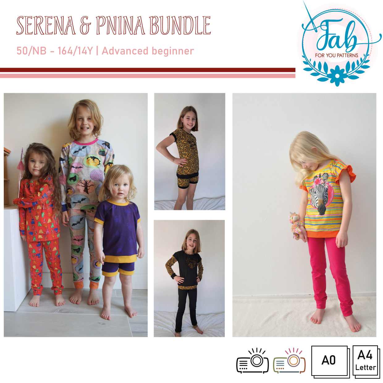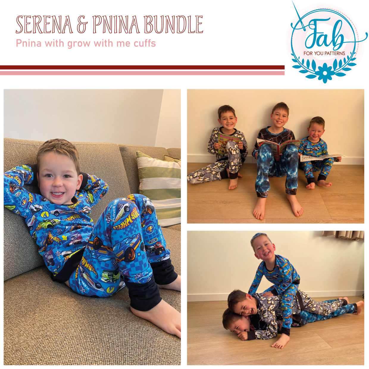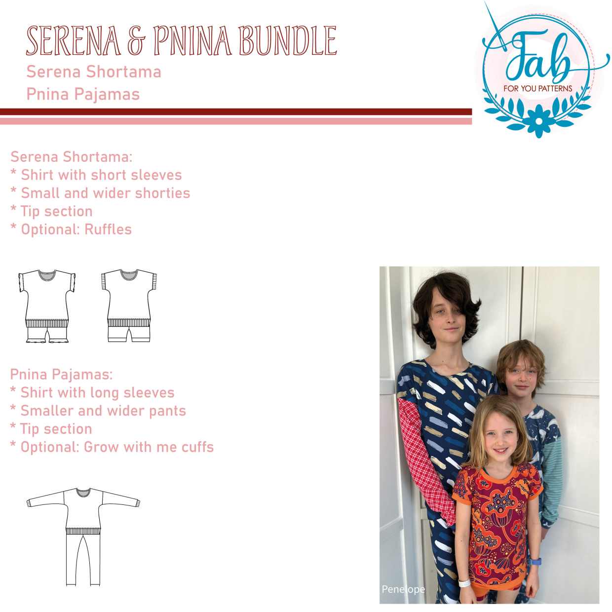 Pnina is a traditional pajamas. The shirt is made with long sleeves. The pants can be made in a smaller and wider option in long length and finished with bands. The complete pajamas can be made without hemming. For the waistband of the pants you can choose from a low yoga, high yoga or elastic waistband. The bands can be made in the main fabric or ribbing, the yoga waistband is made for 4-way stretch jersey. You can choose normal or grow with me cuffs for the pants and shirt.
