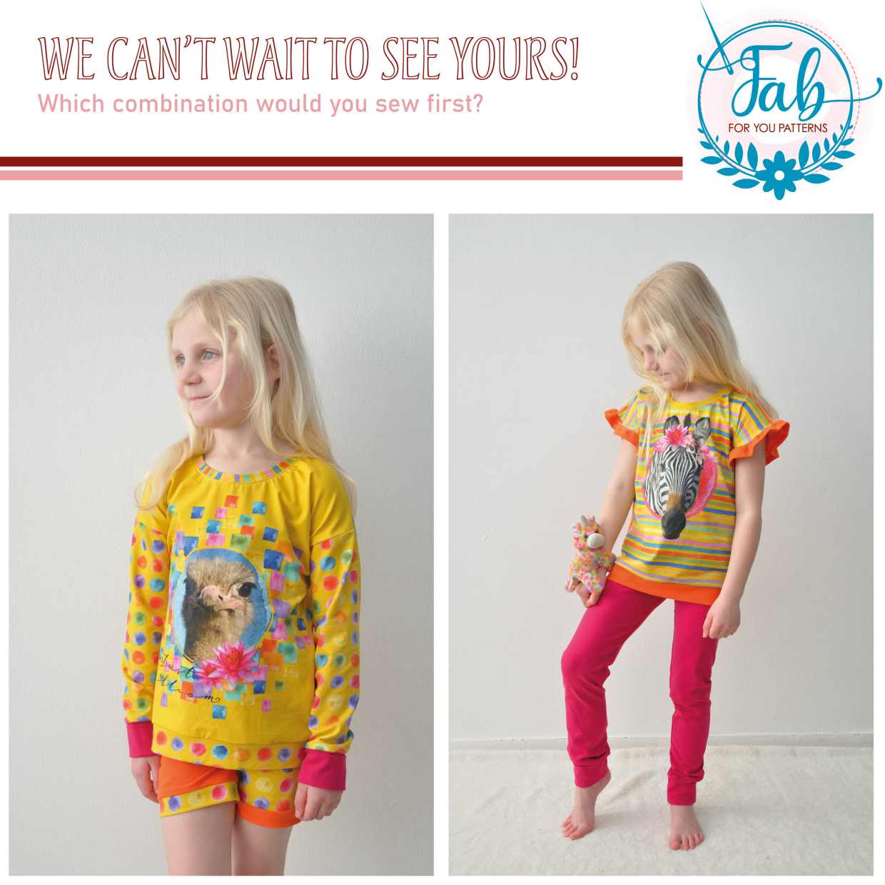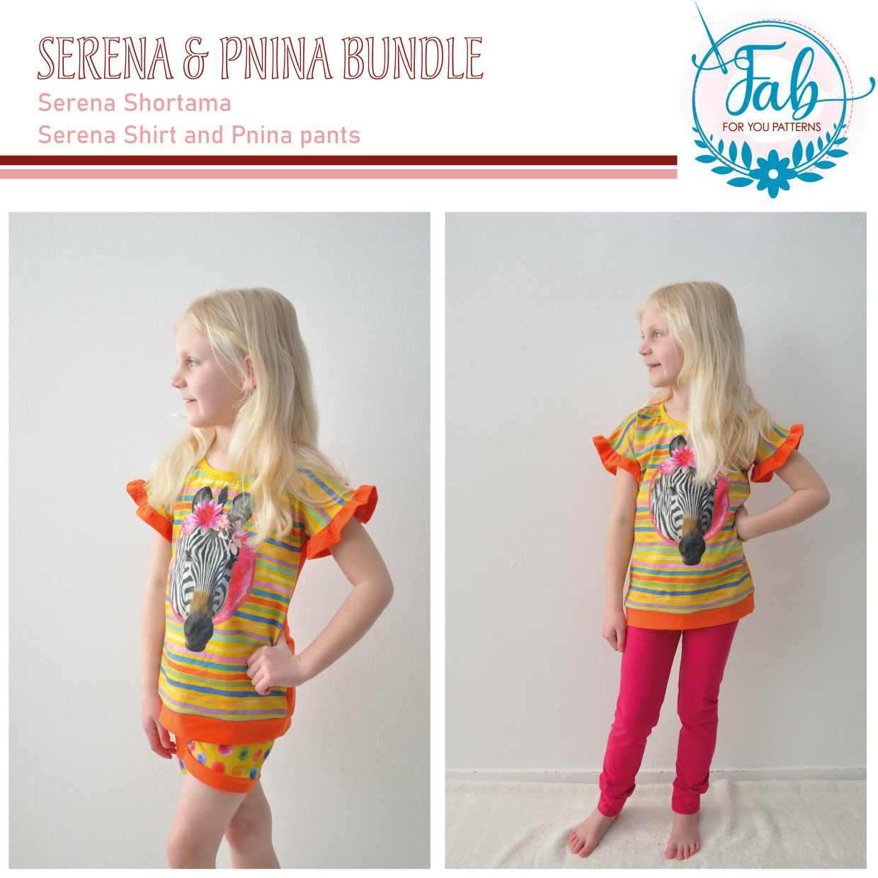 Serena is a shortama. The shortama contains a wide and a smaller fit shorties and a dolan sleeve shirt. The complete shortama can be made without hemming, if you want. For the shirt and shorties there is also a ruffle finish, if you like that. For the waistband of the shorties you can choose from a low yoga, high yoga or elastic waistband. The bands can be made in the main fabric or ribbing, the yoga waistband is made for 4-way stretch jersey.