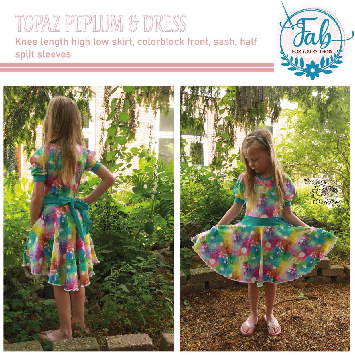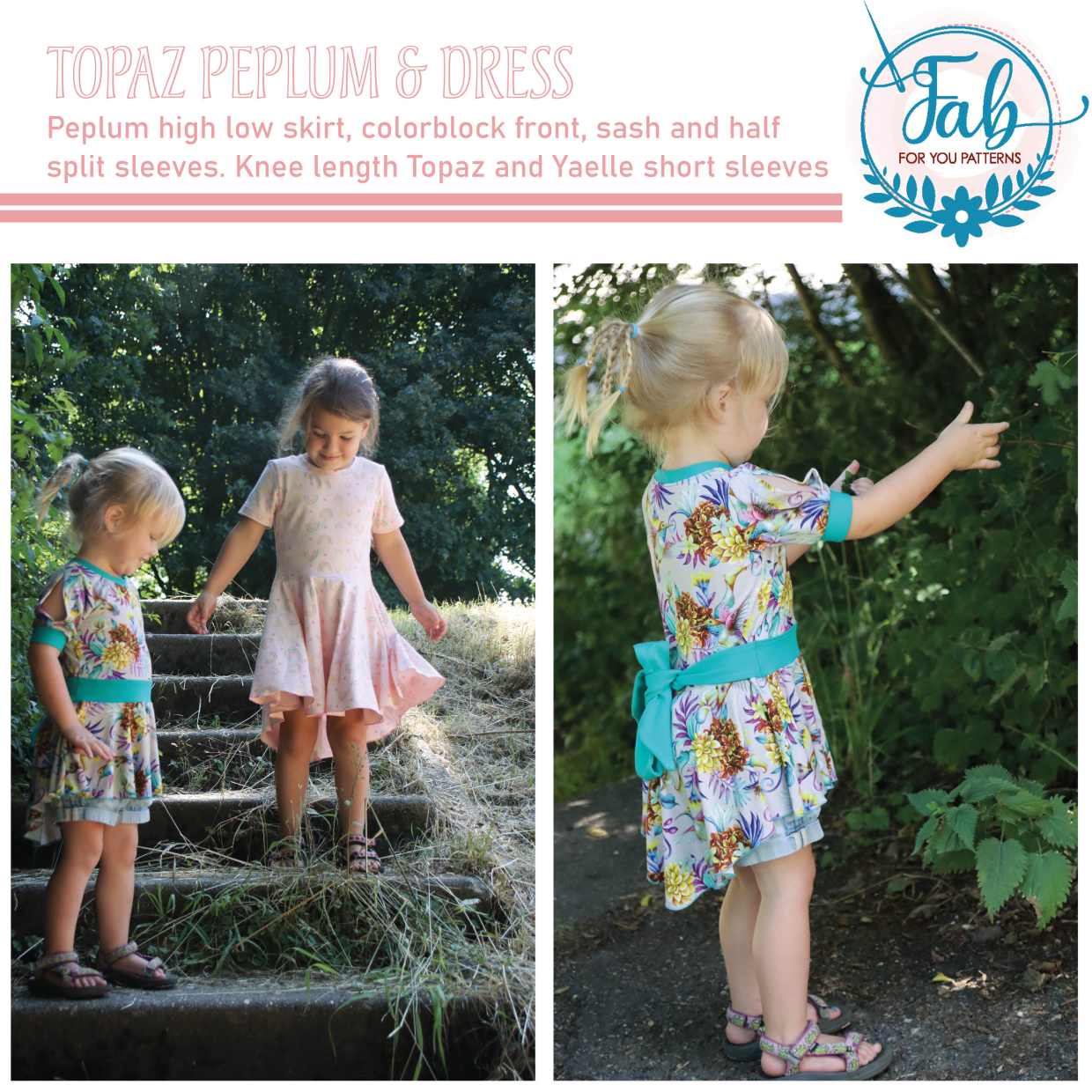 The Topaz peplum and dress is a FAB and fun PDF sewing pattern.The Topaz peplum and dress features tons of options: short circle sleeves and half and long split sleeves. For the bodice there is a plain and colorblocked front and optional sash. For the skirt you can choose from the high-low peplum, knee length skirt with or without ruffled hem and a midi length skirt with ruffled hem. If you like a flirty, girly and twirly dress that can be worn on casual or festive occasions, The Topaz peplum and dress is the must-have pattern for you.