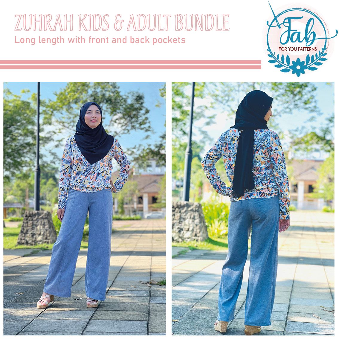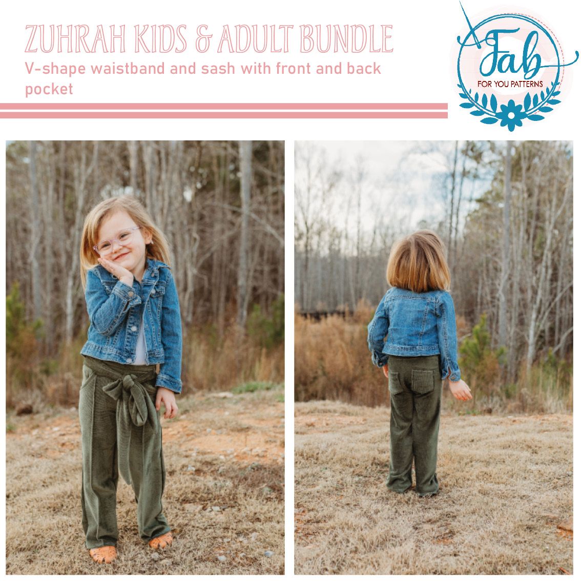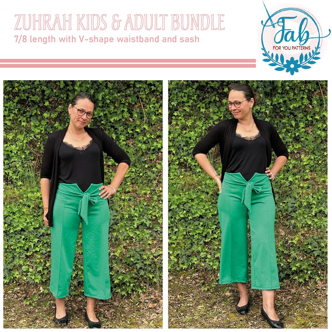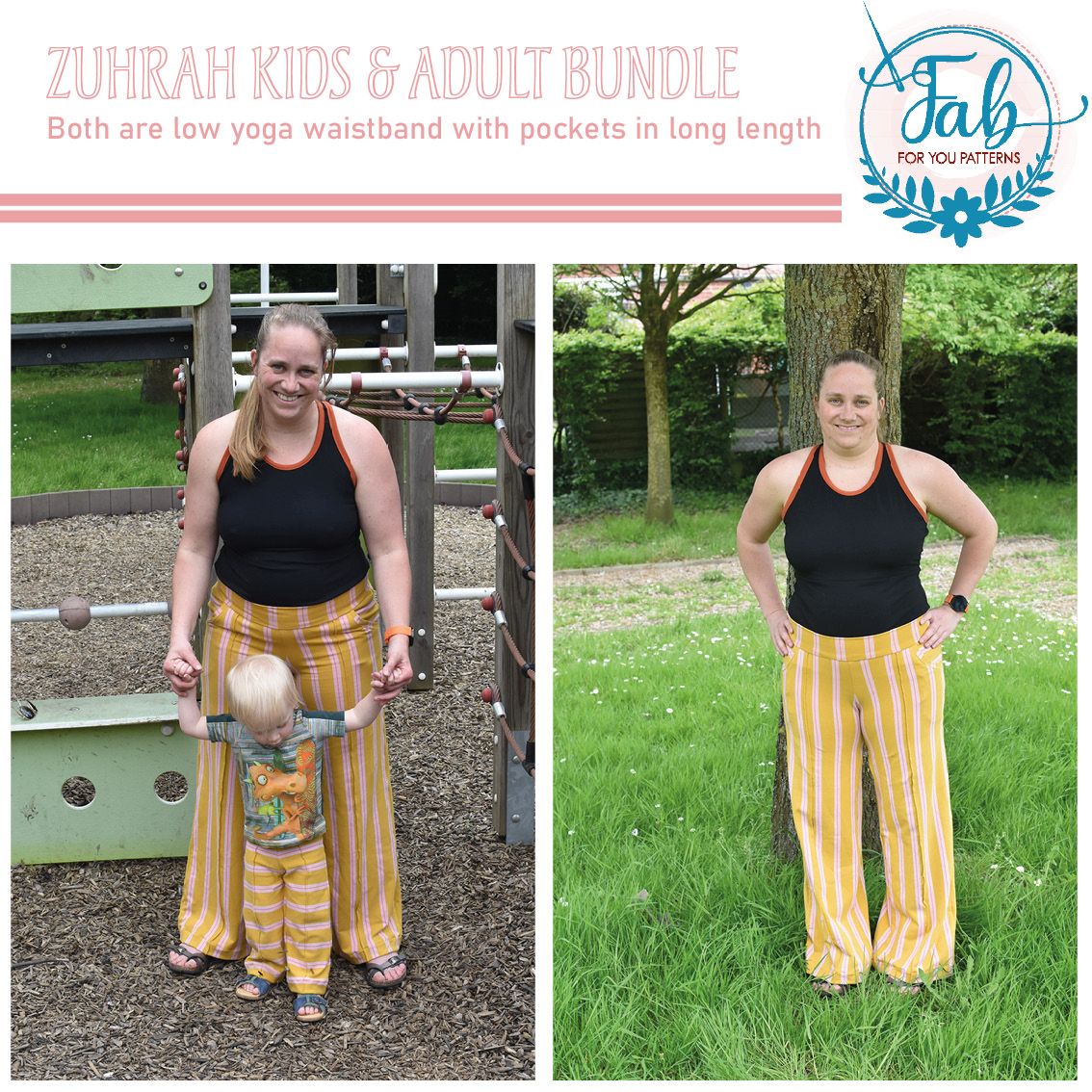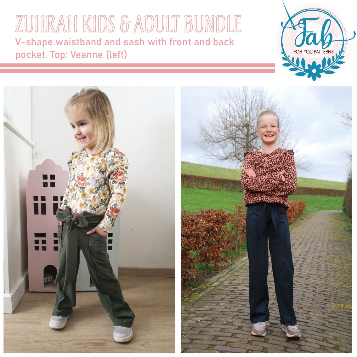 The Zuhrah is a fun and stylish wide leg pants with a pintucked front. Zuhrah has a fitted top and widens out from under the bum. This way Zuhrah is flattering for everybody! There are tons of fun options to customize your pants and make it entirely according to your taste. Add the optional faux fly or leave it out for a quicker sew. Do you want pockets? Zuhrah’s got you covered with optional front or back pockets. Add front pockets to carry your phone or leave them out for a classy dressed-up look. For the waistband you can choose between a low or high yoga waistband, Zuhrah’s signature V-shape waistband with a short or long sash and in the tip section an elastic waistband is provided. What’s better than twinning with your kid in your Zuhrah wide leg pants? When purchasing the bundle, you’ll get all files of the Kids and Adult Zuhrah patterns.
